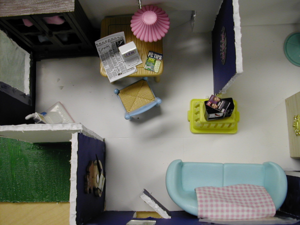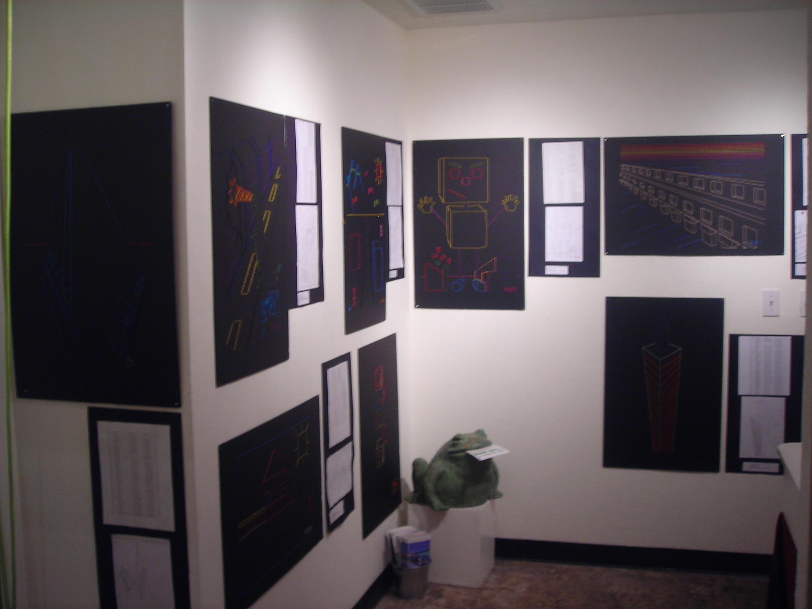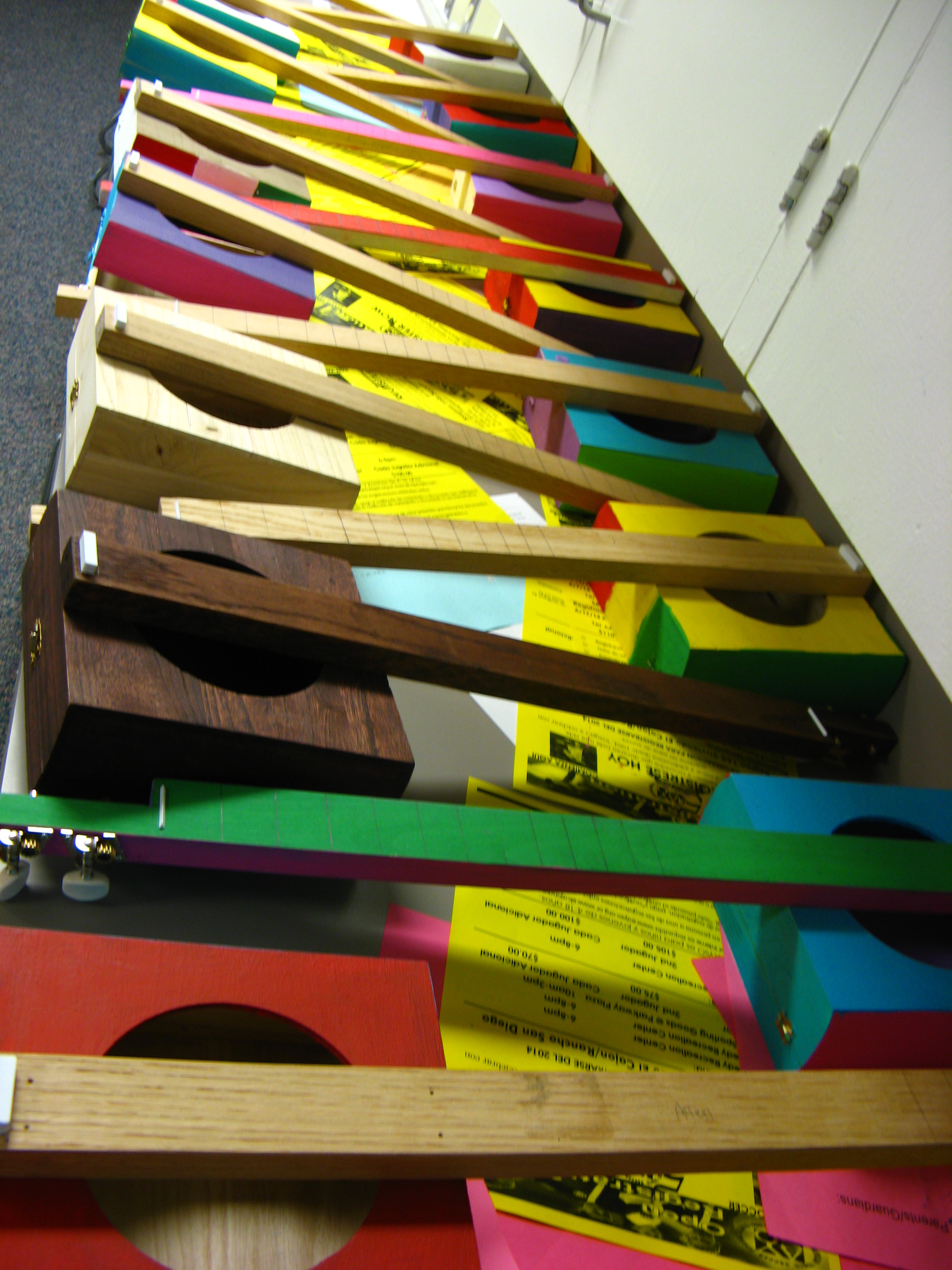 A two-string jewelry box guitar. An artwork made of colored threading on a black foam-core board. A non-traditional sundial. A model home made from index cards.